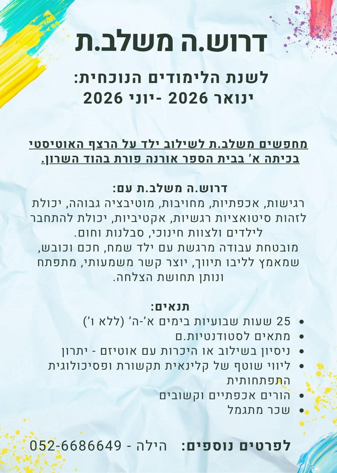 משלב.ת לילד בכיתה א' בבית הספר אורנה פורת בהוד השרון